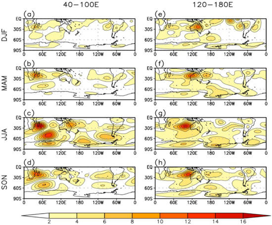 Figure 5 shows standard deviation maps of the circulation responses to the various forcings located between 40–100° E and 120–180° E. During JJA, the forcing over the Indian Ocean induces strong atmospheric variation over the Ross and Bellingshausen seas, and the Western Pacific forcing leads to variation over the Ross and Weddell seas (Figure 5c,g). Although in the figure, a subtropical response seems to initiate in the west or east sides of the Indian Ocean in response to the Indian Ocean forcing or the Western Pacific forcing, the individual subtropical response to each forcing arises near the location of the forcing. Since the divergent wind anomaly emitted from the forcing produces the RWS, the longitude of the RWS is nearly in the vicinity of the tropical forcing even though the RWS can be amplified by the background flow [29,31]. Therefore, the effect of the season tends to be more critical for wave propagation than for RWS generation.