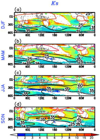 To clarify the wave propagation, the stationary total wavenumber (Ks) is plotted in Figure 6 for the negative meridional wavenumber (l < 0) that is associated with the wave heading toward the south. By examining Ks, we can diagnose where the wave propagates because the wave refracts toward the region with higher Ks values than the wavenumber of the wave. The cubic polynomial equation solution of Equation (5) for l is solved by priority, so the Ks value is calculated where there is a solution for l; wave propagation is not theoretically achieved except for where the solution exists. In the figure, the Ks value exists in the climatological northerly region in the subtropics (see Figure 1a–h). The wave can propagate into the Southern Hemisphere through the northerly near the IOWP during JJA and near the western Pacific during SON, while the wave can hardly penetrate the entire tropics except for the Eastern Pacific during DJF/MAM due to the existence of the southerly in this region (Figure 6a,b). This is the reason why the simulation result shows a weak wave train response when the climatological DJF/MAM background state is initialized (Figure 4 and Figure 5).