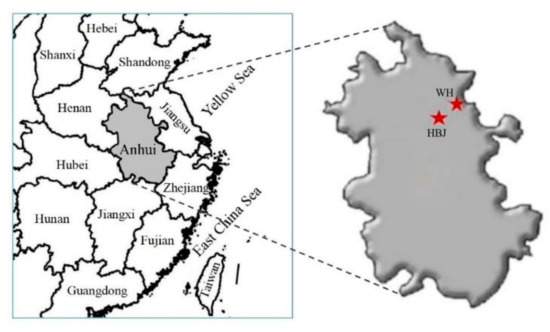 Two sampling sites were selected for the collection of PM2.5 samples, the rooftops of the Bengbu Municipal Bureau of Ecology and Environment (HBJ) and the Wuhe Municipal Bureau of Ecology and Environment (WH) (Figure 1). The HBJ site is located in the urban area of Bengbu and is surrounded mainly by office and residential areas; the WH site is about 40 km away from the urban area of Bengbu City and situated is in an area where lakes and river networks are densely distributed. Generally, the WH site is representative of a suburban environment but is also affected by local industrial activities and motor vehicles.