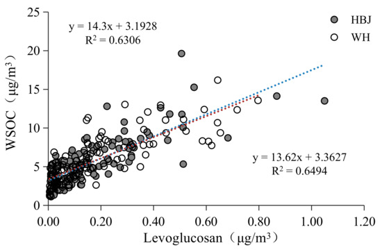 Correlation between levoglucosan and WSOC at the HBJ and WH sites.