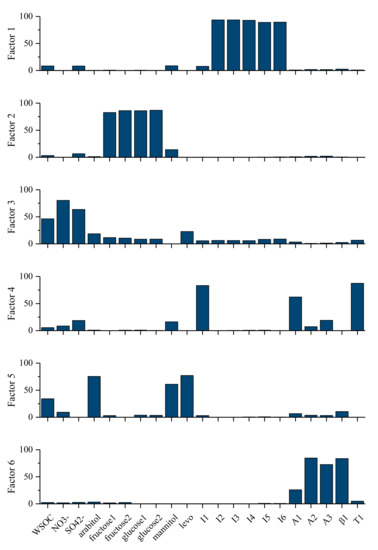 To better understand the sources of SOAs in PM2.5 in Bengbu, source apportionment of SOC was conducted using positive matrix factorization (PMF; U.S. EPA version 5.0). WSOC, nitrate and sulfate ions (NO3−, SO42−), six saccharide compounds (arabitol, fructose 1, fructose 2, glucose 1, glucose 2, manni-tol), levoglucosan, and 11 SOA tracers were included in the PMF analysis, and six factors/sources were retrieved (Figure 3).