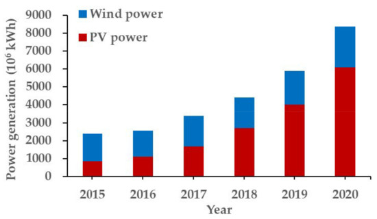 According to the latest statistics [10], the PV power supply in 2020 totaled 6.086 TWh, a 51.6% increase from the previous year (i.e., 4.014 TWh in 2019). By contrast, the actual installation capacity of the PV system accumulated to 5.82 GW at the end of 2020, which was very close to the program’s goal.
