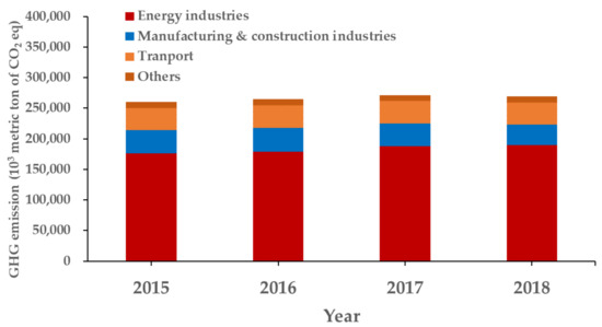 As described above, the energy sector is the most important GHG emission source in the past decades. Classified by activity and source structure in the energy sector [2], their respective GHG emissions in 2015–2018 (Figure 3) and percentages in 2018 are given below (Table 7):