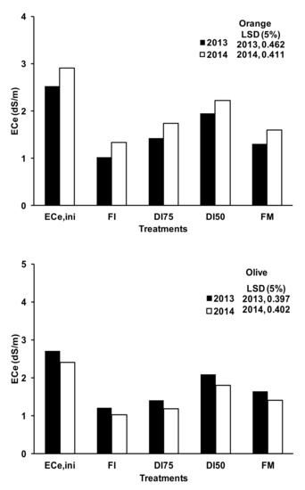 Fruit yields and weights were higher in 2013 than in 2014 under all treatments. In contrast, TSS was higher in 2014 than in 2013. These results may be assigned to physiological responses of orange trees to water and salinity stresses induced by the higher salinity in 2014 and the stress due the high initial soil salinity (ECe,ini). Thus, the yield decrease in 2014 could be attributed to the higher ECe,ini in that year, which affected all treatments. Furthermore, Aragüésa et al. [30] reported that the relative productivity of peach trees tended to decrease above a threshold ECe value of about 4 dS·m−1, whereas Grieve et al. [31] and Nicolás et al. [32] reported that fruit yields decrease about 13% for each 1.0 dS/m increase in ECe when soil salinity exceeds a threshold ECe of 1.4 dS·m−1.