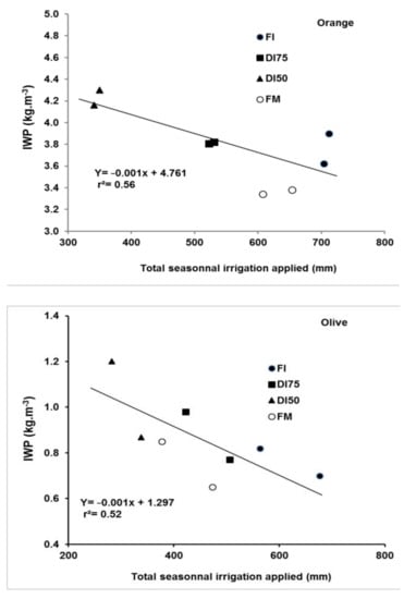 Water productivity (WP), measured as fruit yield (kg) per cubic meter of irrigation water, decreased as applied water increased (Figure 6), confirming previous results of studies on peach trees [34] and almond trees [6]. It varied between 4.3 and 3.3 kg·m−3 for orange, 1.2 and 0.65 kg·m−3 for olive, and 1.3 and 0.74 kg·m−3 for grapevine observed under the DI50 and FM treatments, respectively. The highest WP was obtained under DI50, which used about 50% of irrigation the water of FI and 54%, 59%, and 73% of FM for orange trees, grapevines, and olive trees, respectively. That treatment (DI50) increased significantly the WP compared with the FI treatment in 2013 (11% for orange trees, 24% for olive trees, and 43% for grapevines) and in 2014 (15% for orange trees, 46% for olive trees, and 73% for grapevines). Most of the studies addressing WP in peach, table grape, orange, and olive under deficit irrigation reported an increase in comparison with full irrigation practices, although with lower yields under a moderate or severe water stress [40,44,45,46,47], whereas the grower’s treatment (FM) had lower values of WP. It is of note that WP values recorded under FI treatment were over the regression line (Figure 6) and those under FM were beneath this line, which indicated a better water use by FI and a lower efficiency of the grower’s irrigation program. The low WP for the FM treatment during the two years can be attributed to reduced yields but also to relatively higher irrigation water use.
