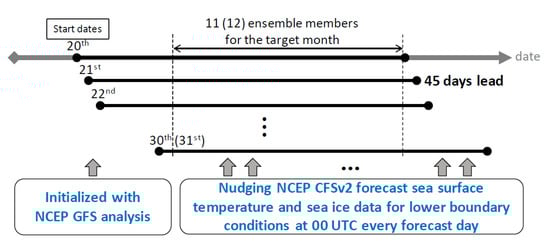 Figure 1 is the schematic diagram of the hindcast experiments. Totally 315 45 day hindcasts are made for December, January, and February (DJF) from 2011 to 2020. Each hindcast is initialized with the analysis data of the National Centers for Environmental Prediction (NCEP) Global Forecast System (GFS) on 0.25° × 0.25° grids [49]. The 45 day hindcasts start at 00 UTC from 20 to 30 (31) in November, December and January. The NCEP Climate Forecast System Version 2 [50] forecast sea surface temperature (SST) and sea-ice data are used as lower boundary conditions at 00 UTC for every simulation day. There are 11 ensemble members for December and 12 ensemble members for January and February that construct time-lagged ensembles. The strategy of time-lagged ensembles has been studied and applied in different ranges of forecasts from 1–3 h up to 6–15 days. The time-lagged ensemble method can improve the forecast skill of deterministic forecast and provide probabilistic forecasts [51,52,53,54,55,56,57,58,59,60,61]. There are several methods of selecting different weights to generate the ensemble mean [53,62]. However, the equally weighted ensemble method is used as a first approach to analyze the performance of target months. In this study, monthly will be referred to the target month, and week 1–week 4 will be referred to the first to the fourth week in the target month.