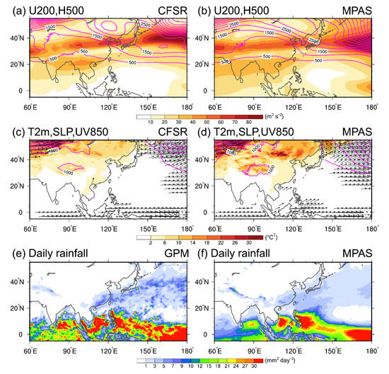 MPAS simulated climatology also captures these features (Figure 2b,d,f). The correlation coefficients (R), normalized root-mean-square errors (NRMSE), and mean bias are listed in Table 2. The NRMSE is the root-mean-square error normalized by the observed standard deviation [81]. Seven variables are selected to verify the model performance, 500-hPa geopotential height (H500), 200-hPa zonal wind (U200), sea-level pressure (SLP), 2-m temperature (T2m), 850-hPa zonal wind (U850), 850-hPa meridional wind (V850), and daily rainfall (RAIN). Table 2 indicates that the correlation coefficients are in general greater than 0.9 except for V850 and RAIN, which also exceed 0.871 and 0.898. Individually, the MPAS has more skill in simulating H500, U200, and T2m. The SLP, RAIN and 850-hPa winds have larger NRMSE. The mean bias of T2m is −0.58 °C, and the mean bias of simulated daily rainfall is about 0.32 mm day−1. Figure 2f also indicates that the climatological rainfall in MPAS is larger than the GPM-retrieved rainfall in most small rainfall areas. Additionally, MPAS simulates stronger northeasterly 850-hPa winds in most of our experiments (a negative bias in 850-hPa winds). Figure 3 evaluates the interannual variances. MPAS also captures the spatial distributions of variances (R exceeds 0.9 for H500, SLP, T2m, and U850, whereas R exceeds 0.8 for U200, V850, and RAIN), and most of the mean biases of simulated interannual variances are positive except for RAIN.