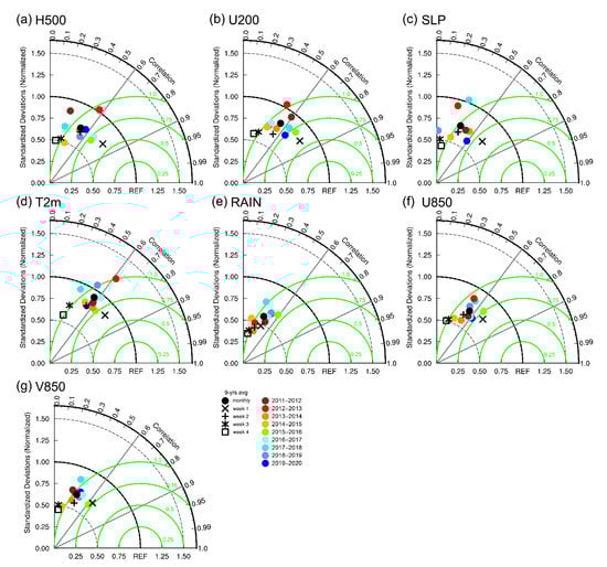Taylor diagrams for (a) H500, (b) U200, (c) SLP, (d) T2m, (e) RAIN, (f) U850, and (g) V850 anomalies. Colors are the monthly mean of 2011–2012 to 2019–2020 DJF. Black dots, crosses, plus, asterisks, and squares are 9-years averaged scores of monthly, week 1, week 2, week 3, and week 4, respectively. Green circles are the normalized root-mean-square errors.