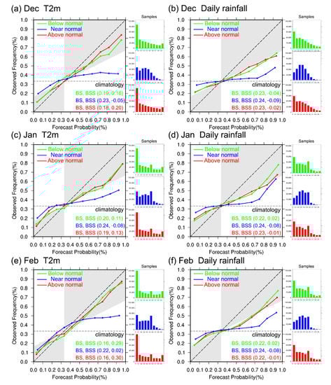 Reliability diagrams for the three-category probabilities of monthly averaged T2m (left column) and averaged daily rainfall (right column) on (a,b) December, (c,d) January, and (e,f) February. Green, blue, red lines denote the below normal, near normal, and above normal categories. The thin dashed line is 0.333 according to the observed frequency of climatology for the three-category method. The Brier score (BS) and the Brier skill score (BSS) are denoted at the right bottom of each figure.