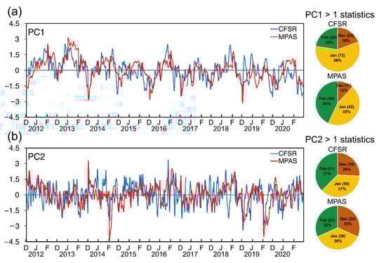 The normalized principal components of two leading EOF modes over the 2011–2020 winter for CFSR and MPAS ensemble mean are shown in Figure 8. The first and second EOF modes explain 37.8% (51.2%) and 14.8% (12.1%) of the temperature variance for CFSR (MPAS) over East Asia. The correlation coefficients for the first principal component (PC1) and the second principal component (PC2) are 0.60 and 0.35. The days that normalized principal components greater than 1.0 standard deviation are defined as significant PC1 and PC2 events. CFSR has 124 days and MPAS has 93 days of significant PC1 events over 2011–2020 DJF. For the month distribution of these PC1 event days, December, January, and February respectively occupy 19%, 58%, and 23% for CFSR while those for MPAS occupy 12%, 45%, and 43%. By contrast, MPAS has overestimation in February and underestimation in January. As for the significant PC2 events, there are 136 days for CFSR with 26%, 37%, and 37% in three separate months and 104 days for MPAS with 32%, 36%, and 32%. MPAS has a slight underestimation in both January and February. In summary, the MPAS ensemble mean underestimates the total number of significant PC1 and PC2 events. Individually, MPAS tends to overestimate PC1 events and underestimate PC2 events in February.