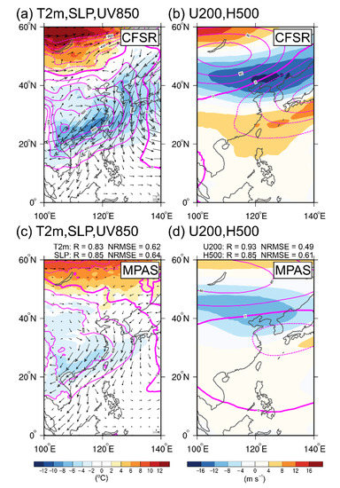 The difference between the composite anomalies of PC1 and PC2 greater than 1.0 and less than −1.0 standard deviation is shown in Figure 9 and Figure 10. MPAS simulates reasonable temperature patterns for the northern and the southern modes, with R = 0.93 and 0.83, respectively (Figure 9a,c and Figure 10a,c). However, the magnitude of the cooling temperature is underestimated. MPAS also captures the features of SLP, with R = 0.89 and R = 0.85 for the northern and the southern modes. The positive SLP anomalies are consistent with the surface temperature, which is located at the north (south) of 40° N for the first (second) mode. MPAS also captures the features in the upper troposphere. The R of U200 and H500 exceed 0.91 (0.93) and 0.97 (0.85) for PC1 (PC2). For PC1, negative H500 anomalies located near Korea and Japan, and positive U200 anomalies located at about 30° N imply that a significant westward-moving East Asian trough is accompanied by a strong East Asian westerly jet (Figure 9b,d). For PC2, the negative H500 anomalies extended southward to the south of 30° N, which indicates the deepening of the East Asian trough. The deepening of the East Asian trough also coincided with the southward moving positive SLP anomalies and results in the intensification of northeasterly winds and colder surface temperatures near Taiwan (Figure 10a,c).
