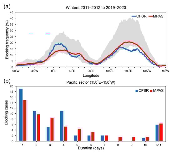 (a) Percentage frequency of blocking as a function of longitude for CFSR (blue) and MPAS simulations average (red). The shading area is defined by the minimum and maximum values of the ensemble members. (b) Histograms of the averaged blocking cases as a function of durations for the Pacific sector (150–210° E).
