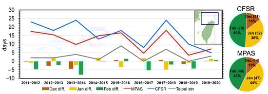 Annual trend of cold events days for MPAS (red line), CFSR (blue), and Taipei station (gray). The cold events are defined as the minimum 2-m temperature less than 10 °C in the region of 24.75–26.5° N, 120–122.5° E for MPAS and CFSR. Bars represent the number of days between MPAS and CFSR in December (brown), January (yellow), and February (green). The pie chart shows the event days in December (brown), January (yellow), and February (green) for MPAS and CFSR.