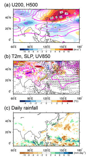 The climatology over 2011–2020 demonstrates consistent characteristics with typical EAWM patterns. The East Asian trough near the coast of East Asia and a strong East Asian westerly jet located in southern Japan are the most prominent features in the mid and upper troposphere (Figure 2a). The Siberian High and Aleutian Low dominate in the surface (Figure 2c). The mean daily rainfall is most significant in the South China Sea and the western Pacific in the tropics (Figure 2e). The second significant rainfall area locates at 30–40° N, 120° E–180 in mid-latitudes.