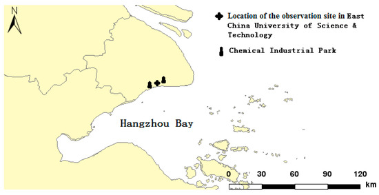 The main field measurement site is established at the air quality monitoring station (30.83° N, 121.50° E) in the Fengxian Campus of East China University of Science and Technology (ECUST), Shanghai. As shown in Figure 1, the sampling site is located in the northern region of the Hangzhou Bay in Shanghai. There is a chemical industrial park in the northeast area and another larger chemical industrial park in the southwest of the campus. There are more than 50 companies in the chemical industrial park, including petrochemical industry, synthetic resin industry, inorganic chemical industry, sulfuric acid industry, nitric acid industry, rubber industry, etc. The observation campaign of BC was conducted throughout the whole year of 2018.