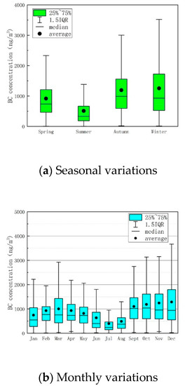 Seasonal and monthly variations in BC in 2018. (Note: The box and whisker plot shows the range of BC concentration.; the centerline of each box is the median, the box represents the 25th through 75th percentile; the whiskers represent the most extreme value within 1.5 times the interquartile range).