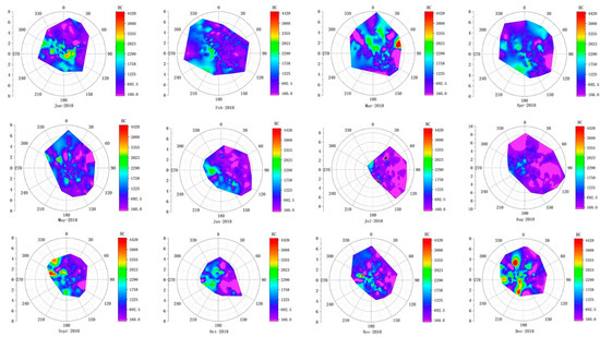 In order to study the influence of weather conditions upon BC concentration, rose maps combining the wind direction and wind speed were used, shown in Figure 3. The northern region of Hangzhou Bay is characterized by monsoon climate, with southeast winds prevailing during spring and summer and northwest winds prevailing during autumn and winter.
