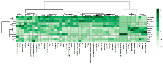 In order to reveal the source connection of BC with other air pollutants, the cluster analysis of the annual BC concentration, meteorological parameters, conventional pollutants, and VOCs-36 are shown in Figure 4. The clustering heatmap showed that the most severe BC pollution occurred in October, November, and December in 2018. Specifically, for December, the color of the square lattice, which represents the concentration of BC, is the darkest, indicating the worst pollution. In general, BC had no correlation with the concentrations of 1,3-Butadiene, cis-2-Butene, Octane, Isoprene, Alkenes and alkynes, Ethylene, Propylene, Trichloroethylene, trans-2-Butene, or 2,3,4-Ttrimethylpentane. However, the cluster analysis graph showed that the annual BC pollution is highly correlated with the concentration of n-Butane and VOCs-36, sharing the same group as 1,2-Dichloroethane, NOx, NO2, and Benzene.