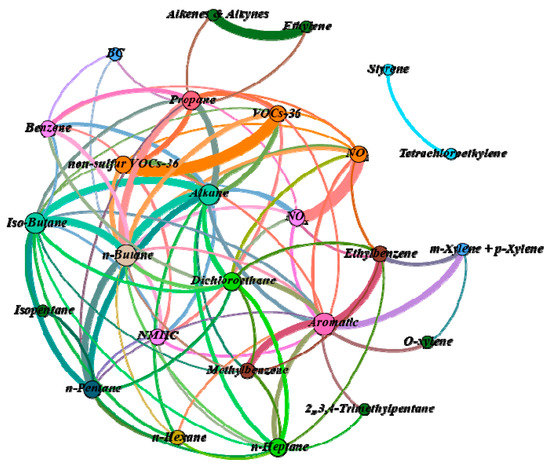 For a qualitative discussion of the relationship between BC and other pollutants, we conducted Spearman analysis on the data obtained during December 2018. We selected Spearman rank > 0.8 and p < 0.01 as the conditions to plot the network diagram, as shown in Figure 9b. A connection was found between BC and Benzene, non-methane total hydrocarbons (NMHC), Alkanes, Alkenes and alkynes, n-Butane, Toluene, n-Heptane, nitrogen dioxide (NO2), and nitrogen oxides (NOx). The characteristics of BC in the northern region of the Hangzhou Bay in December are highlighted in Figure 9b.