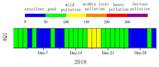 AQI (the air quality index) in December 2018. Adapted from Ref. [51]. (Data from the website of Shanghai Municipal Bureau of Ecology and Environment: https://sthj.sh.gov.cn/, accessed on 12 August 2020).