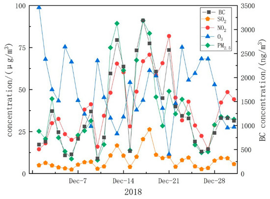 Daily average concentration of BC, SO2, NO2, O3 and PM2.5 in December 2018.