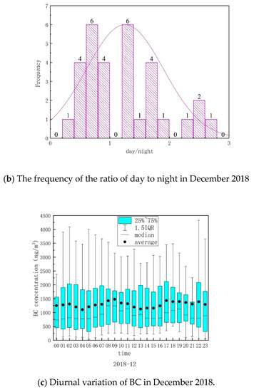 The diurnal variation of BC and the day/night ratio of BC in December of 2018 was shown in Figure 8. The highest concentration of BC was observed in the middle of December, and the concentrations during both day and night were much higher than those in other periods (Figure 8a). Herein, we define 6:00 to 18:00 as daytime and 18:00 to 6:00 as nighttime. It was found that there were 15 days less than 1, and 16 days left had a ratio larger than 1. However, there were only 4 days during which the ratio was between 0.8 and 1.2. There were 11 days which the ratio of day to night was less than 0.8, and the ratio was only 0.34 on 20 December. This means the emission of BC at night is much heavier than that in the daytime. This may be related to the transportation of the surrounding chemical industrial parks in the night-time. There were 16 days which the ratio was greater than 1.2, and the ratio was greater than 2 on 9, 11, 16 and 27 December. That means traffic sources contributed a lot to emission of BC in the daytime (Figure 8b).