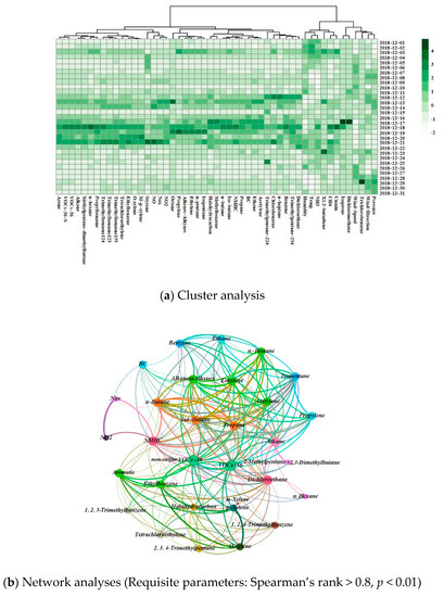 As mentioned before, the concentration of BC was found to strongly correlate with VOCs-36. To perform further analyses, a clustering heatmap was conducted based on the data of various pollutants in December 2018 as shown in Figure 9a. The clustering heatmap showed that BC can be grouped with acetylene, ethane, propane, non-methane total hydrocarbons, iso-butane, n-butane, toluene, and halohydrocarbon. Different from the weak correlations based on the annual data, BC exhibited a stronger relationship with acetylene and ethane and had the darkest color on the cluster analysis graph for December 17th. All the pollutants had darker colors for the middle of December.