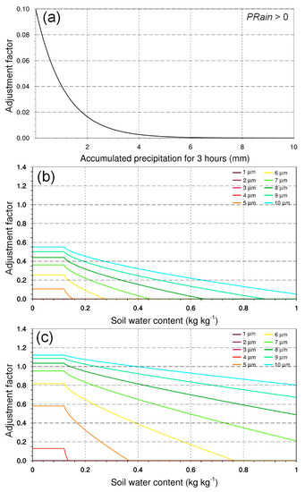 | ADAM3_RAIN | RH10, PRain | Precipitation over the 3-h period from 6 to 3 h prior to dust generation calculation (PRain) was added to the dust generation term in CNTL to represent the surface-wetness effects |