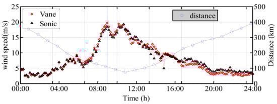 Comparison of the 10 min wind speed from a vane anemometer and a sonic anemometer.