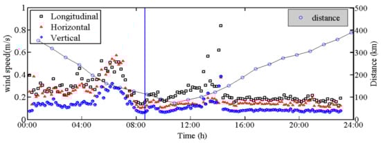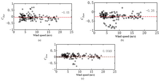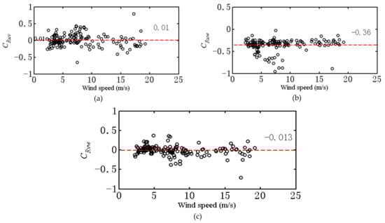 Correlation between the fluctuation wind speed at 10 m. (a) u and v directions; (b) u and w directions; and (c) v and w directions.