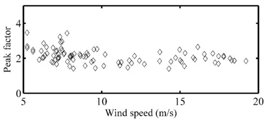 Peak factors at different wind speeds during Typhoon “Maria” (t = 3 s).