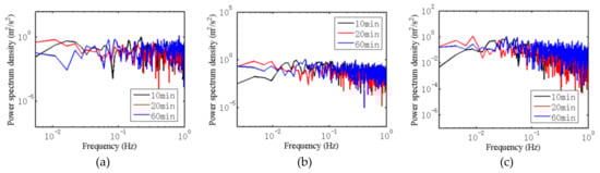 Power spectra of the longitudinal wind component for different time interval at (a) 10 m, (b) 80 m, and (c) 100 m.