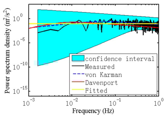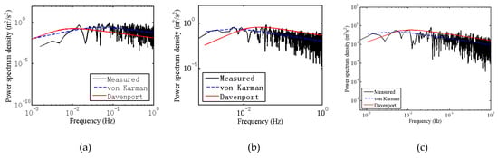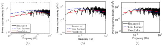 Power spectra of the longitudinal wind component at (a) 10 m, (b) 80 m, and (c) 100 m.