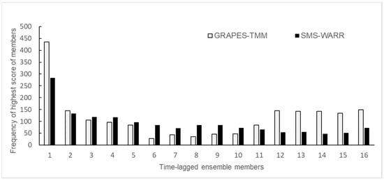 By comparing the distribution of the frequency of highest precipitation forecast scores of ensemble members in GRAPES-CHAF and SMS-WARR with 32 different ensemble members in the next six hours (Figure 3), it can be found that the highest score of time-lagged ensemble members occur more frequently when they are close to or far away from the forecast reference time, and few high scores occur in the middle of forecast reference times in GRAPES-CHAF. In SMS-WARR model, the highest scores of ensemble members appear more frequently when they are close to the forecast reference time, and little difference among other ensemble members. Through statistics, it can be found that although some members of the two models obtain the highest score when they are close to the forecast reference time, the probability is less than 20%. Due to the continuous adjustment and updating of the model, it costs lots of time to select the best forecast member manually. Through the time-lag-ensemble forecasting method, the revised precipitation forecast products can be directly provided, and the forecast efficiency can be greatly improved.