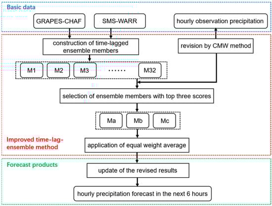Based on the hourly precipitation data of Hunan automatic weather stations, the hourly precipitation of ensemble members with 16 different forecast reference times in the past three hours in each model is dynamically evaluated by using the cross-magnitude weight method. The forecast of the ensemble members with the top three scores is selected to revise the hourly forecast in the next six hours. The process is shown schematically in Figure 4.