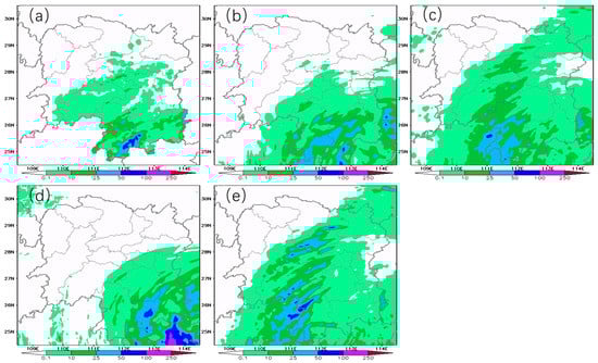 Compared with deterministic model prediction, ensemble prediction can provide uncertain prediction information by using multiple initial values or models to estimate the probability distribution of prediction error [,,]. Previous studies have shown that even low-resolution ensemble models have higher prediction skills than single high-resolution models [,]. Although ensemble forecasting has significantly improved short and medium-term forecasting skills, it is still insufficient for local short-range heavy precipitation weather forecasting []. As the precipitation forecast is greatly influenced by the “spin-up” of the numerical model and the initial values, the traditional numerical forecast model which updates the initial field of the model every six hours or more is not suitable for short-range forecast. It is necessary to develop a data assimilation and analysis system with a short time interval. Therefore, the model based on the rapid update cycle (RUC) system plays an increasingly important role in short-term rainstorm weather forecasts and early warning [,,,,,]. In recent years, a great number of scientific research institutions in China have established rapid update assimilation forecasting systems with different techniques. Meteorological research institutions in Beijing [], Shanghai [,], Guangzhou [,] and Wuhan [] have established RUC forecast systems for short-range forecast and meteorological services in north, east, south, and central China, respectively.
