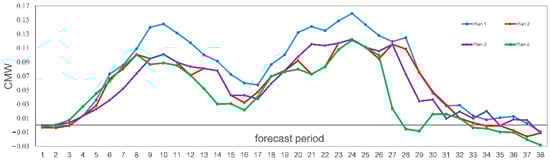 By comparing the hourly forecast of the ensemble member with the highest score and the equally weighted average forecast of ensemble members with top three scores, and the forecast at the nearest forecast reference time (Figure 6), it can be seen that in the early, middle and late stages of typhoon precipitation, the score of Plan 1 is the highest. The scores of Plan 2 and Plan 4 are higher than that of Plan 3 in the early stage of typhoon precipitation. In the middle stage of typhoon precipitation, there is little difference among them, but Plan 4 has almost no ability to predict the later stage of typhoon precipitation.
