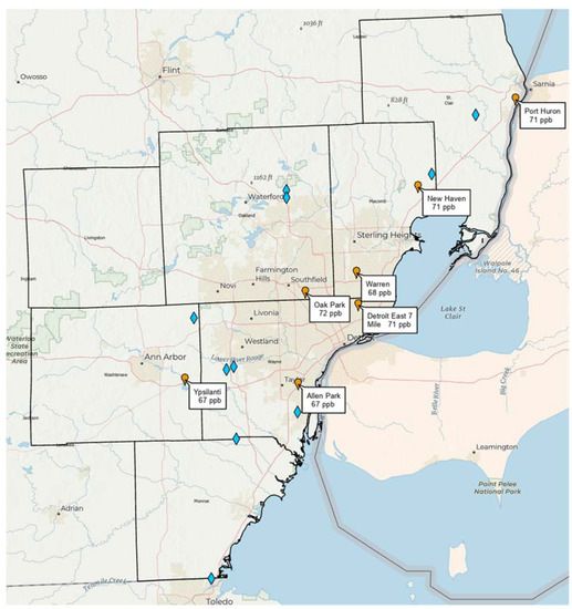 Locations of major solid waste landfills (blue diamonds) in the seven counties of the Southeast Michigan ozone non-attainment area relative to ozone monitoring stations (orange markers) run by the Michigan Department of Environment, Great Lakes, and Energy (EGLE). Stations are shown with corresponding 2018–2020 ozone design values.