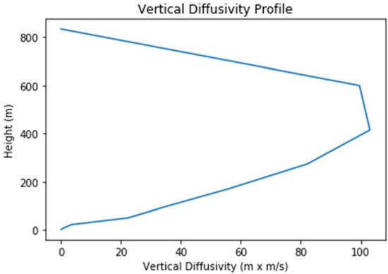 A constant horizontal wind was assumed to prevail, with a wind speed of 4.45 m/s derived from the magnitude of the vector-averaged 8 h wind at the Oak Park monitor (42.463° latitude, −83.183° longitude), the location of the highest ozone design value in the Southeast Michigan non-attainment area. The wind direction, however, was arbitrarily set to the southwesterly direction (225°) to allow for maximum plume range within the model domains and to represent generally prevailing conditions during ozone exceedances in the target region (note that the vector-averaged wind direction during the actual 8 h period was 190°). While a zero vertical wind speed was assumed, the model did allow for vertical eddy diffusion, with a diffusivity profile as shown in Figure 2. The horizontal eddy diffusivity, on the other hand, was set at 50 m2/s.