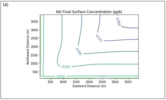 Uniform surface temperature and pressure were assumed for both domains, with the thermal lapse rate equal to the moist adiabatic value of 12 K/km. Relative humidity was also held constant. MicroFACT input parameters were obtained by averaging hourly data for a 4 km horizontal resolution run of CMAQ provided by the USEPA for the 8 h period of interest on 29 June 2018 at a location in Southeast Michigan (42.537° latitude, −83.190 longitude) slightly north of Oak Park, as shown in Table 1 for meteorological parameters. Table 2 shows corresponding 8 h average surface concentrations of 35 species derived from the same CMAQ run. These were used to specify uniform upwind boundary conditions for the 35 advected species. Table 2 also shows dry deposition velocities assumed for some of the species [40,41].