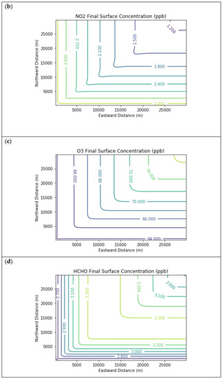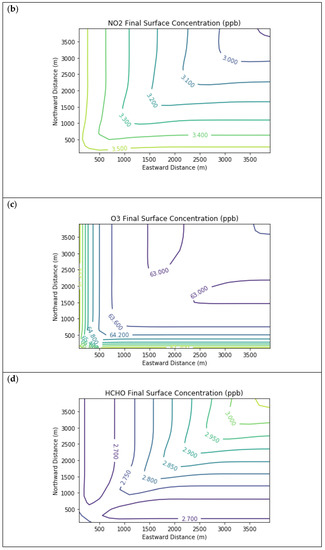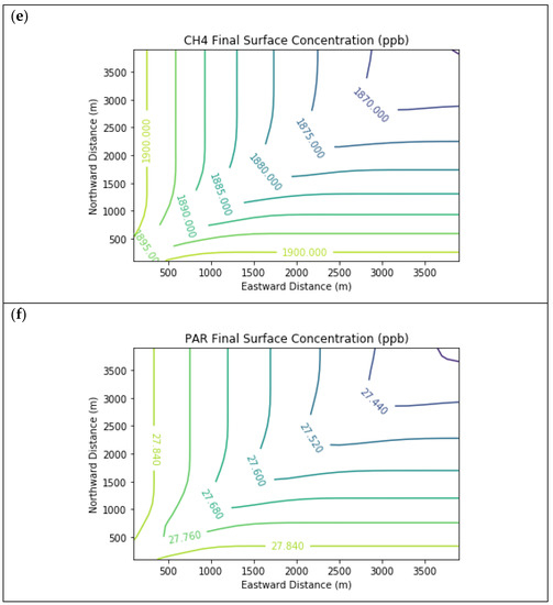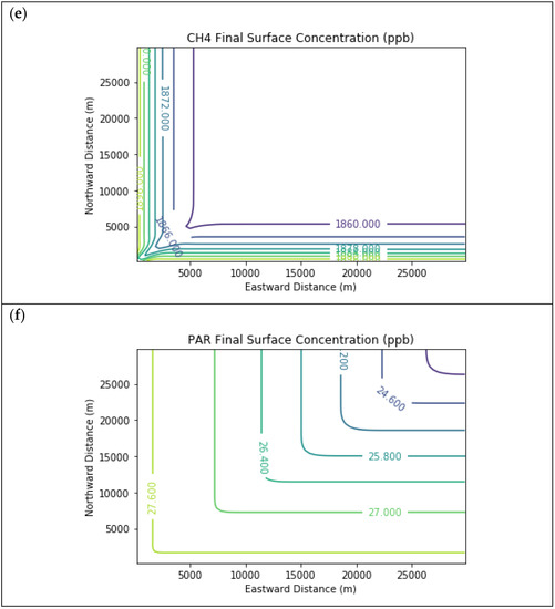 Figure 6 displays surface concentration isopleths for ozone and key precursors for the Baseline scenario, but for the larger 30 km × 30 km domain. In this scenario, the downwind edge of the far-field domain surpassed the inflow ozone concentration due to longer-range photochemical reactions, which also consumed NOx down to about a third of the boundary conditions. Meanwhile, the far-field methane concentration decayed nearly to the global background value with no interior sources in the domain. Formaldehyde peaked in the interior of the far-field domain at 3.3 ppb due to secondary formation.