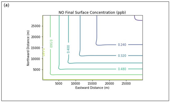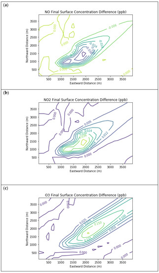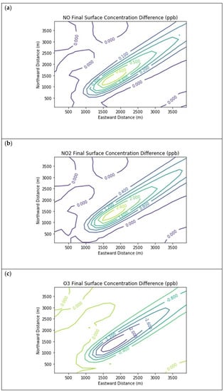 The ozone impacts of the hypothetical landfill are presented in the context of three model scenarios for both the near-source and far-field domains. The first of these scenarios was the Baseline simulation, in which no emissions were present within the model grids, and the ozone generated during the three-hour (12:00–15:00 LST) simulation period was solely due to the propagation of the uniform boundary conditions by a southwesterly wind of 4.45 m/s. The second scenario was the Combustion Only simulation, in which landfill combustion emissions were added to the Baseline scenario conditions according to Table 3. The third scenario was the Fugitives + Combustion scenario, in which fugitive emissions of 3000 kg/h (=28,969 tpy) of CH4 and 13.2 kg/h (=127.5 tpy) of NMOC, the latter speciated according to Table 4, were added to the Combustion Only scenario conditions.