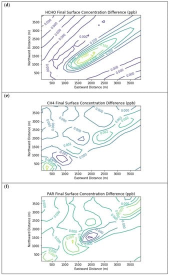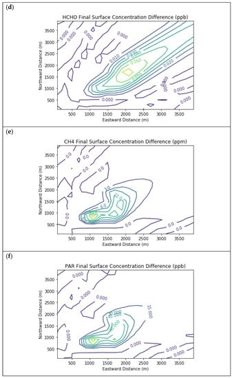 Near Source: Fugitives + Combustion − Combustion Only. Final surface concentrations of (a) NO, (b) NO2, (c) O3, (d) HCHO, (e) CH4, and (f) PAR at the end of the 3-h simulation in the Baseline scenario for the 30 km × 30 km domain.