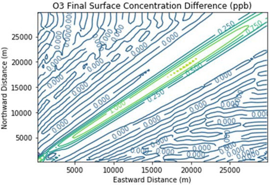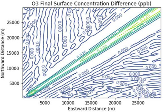 Ozone difference plot between the Fugitives + Combustion and Combustion Only scenarios at the end of the 3 h simulation for the 30 km × 30 km domain.