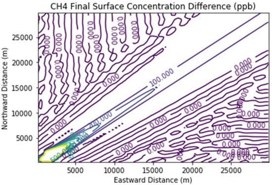 Methane difference plot between the Fugitives + Combustion and Combustion Only scenarios at the end of the 3 h simulation for the 30 km × 30 km domain.
