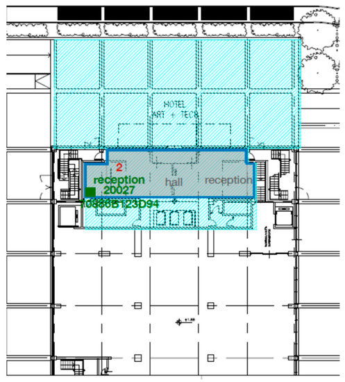 Floorplan of the hall area, with indication about the placing of the monitoring platform.