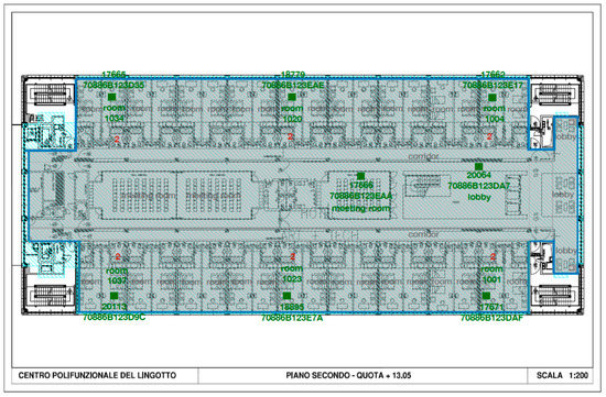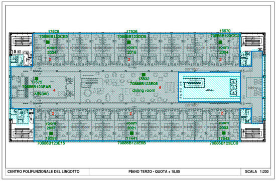 The following figures (Figure 1, Figure 2, Figure 3, Figure 4 and Figure 5) report the outline of the monitored environments (in light blue) and the location of each monitoring device (in green). The placement of the devices has been defined based on a compromise between the ideal location, i.e., the most representative of the average IAQ within the room, and the availability of the power supply. Each device has been installed at least 1.5 m from the floor, on walls free from direct sources of pollution, e.g., HVAC units, printers, cooking or cleaning stations, etc.