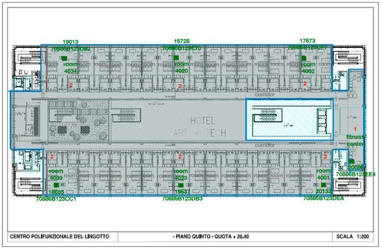 Floorplan of the rooms and fitness center area, fifth floor, with indication about the placing of the monitoring platform.