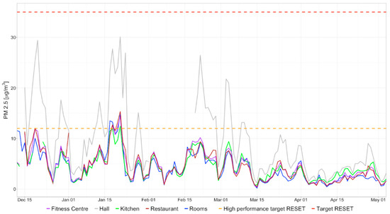 Figure 6 reports the concentration of PM 2.5 for the different environments monitored, over the whole period of monitoring. For the rooms, values are calculated as means of the concentrations detected in the fourteen rooms included in the present study. The target values proposed by the RESET standards for PM 2.5, both for regular and high performance, have been included in the figure, as a reference to support the evaluation of the IAQ in absolute terms.