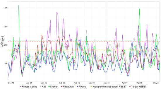 The average VOCs concentrations registered were lower in the rooms and higher in the hall, which displays the highest mean value, fitness center, which presents the highest standard deviation, and restaurant. The kitchen shows two remarkable peaks, the first during the last weeks of December and the second just before the middle of April.